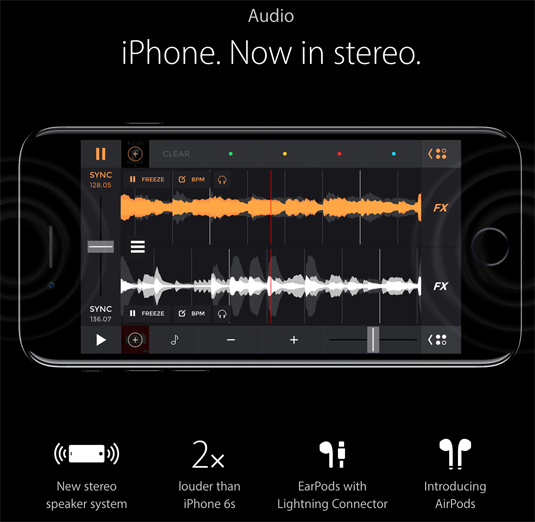 A nivel de sonido, el audio del iPhone7 es totalmente stereo, consiguiendo el doble de volumen que su predecesor, con unos cascos EarPods con el nuevo conector Lightning Connector además de la posibilidad de incorporar los AirPods.